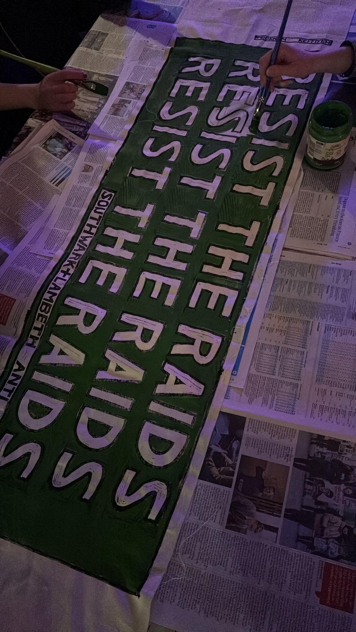 A community workshop printing banners for Southwark and Lambeth Anti-Raids. No sign up required, drop-in.