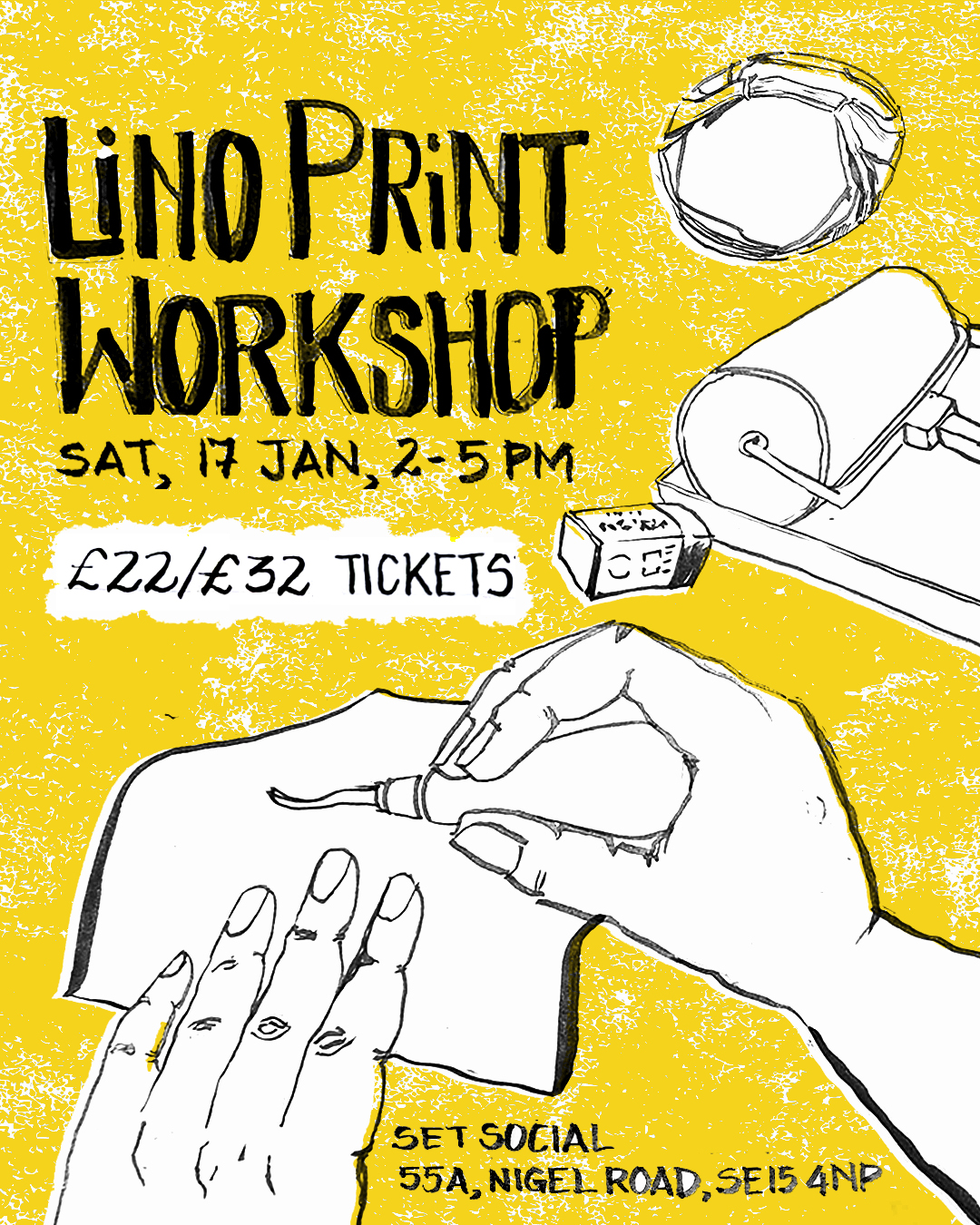 - £22 Standard ticket: includes prints and your carved lino block to take home