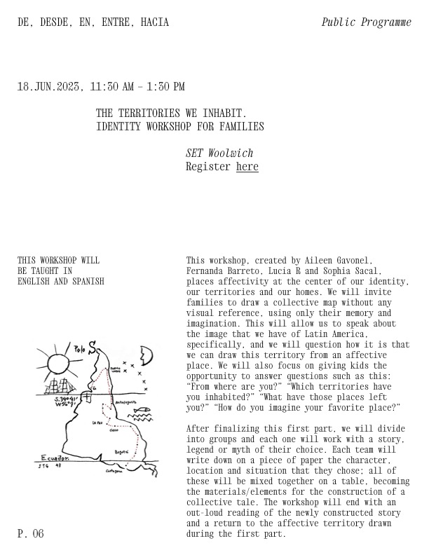 This workshop, created by Aileen Gavonel, Fernanda Barreto, Lucía R and Sophia Sacal, places affectivity at the centre of our identity, our territories and our homes. We will invite families (both Latinx and from other communities) to draw a collective map without any visual reference, using only their memory and imagination. This will allow us […]